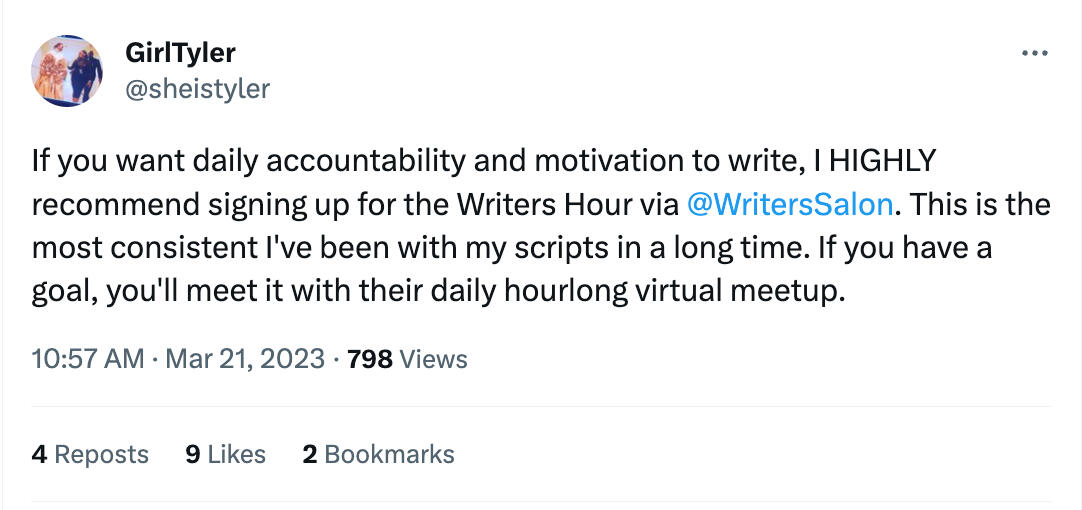 "Writers Hour has the been the prompt I needed to finally start actually writing, after years of daydreaming about it."