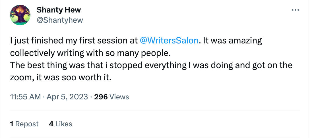 You're also welcome to write with us at Writers' Hour each weekday. Sign up here.