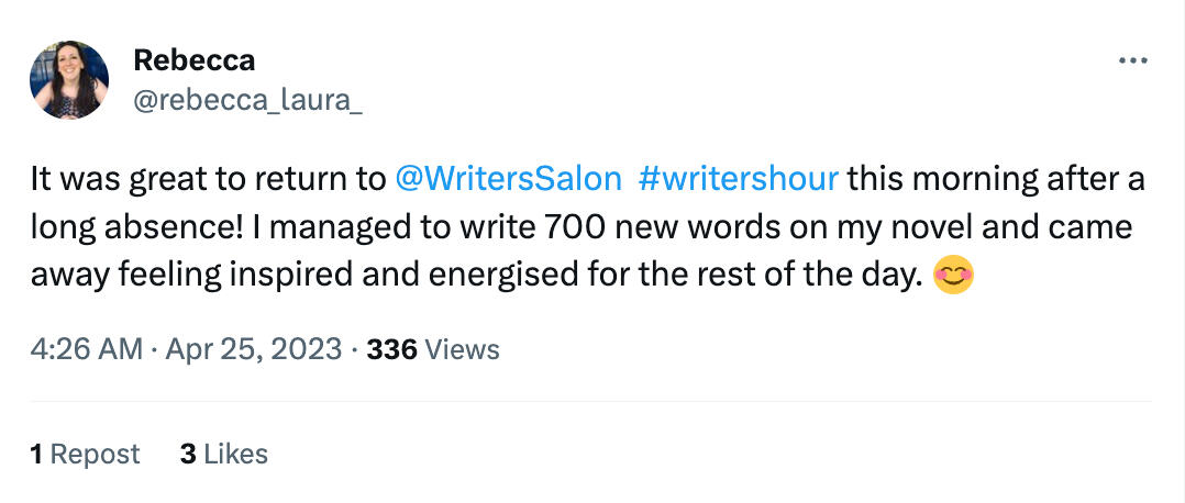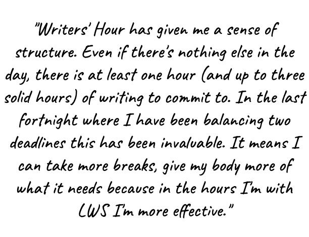 "From Monday to Friday my day is largely structured by Writers' Hours and although I am still a very slow writer, it means that there are at least three hours per day when the gremlins of distraction can’t get at me. Plus I enjoy the feeling of community you engender, which is so nice for us solo wordsmiths."