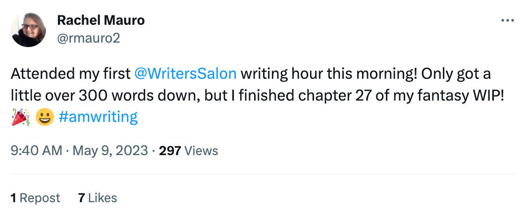 You're also welcome to write with us at Writers' Hour each weekday. Sign up here.