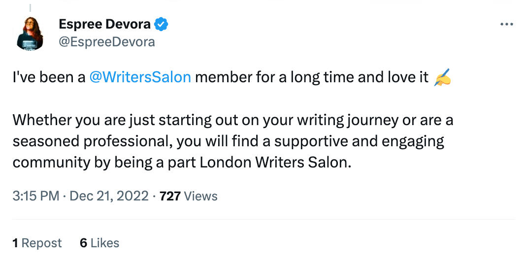 ❤️ Private Online Writer Community🎙 Live Weekly Interviews & Workshops🙋🏽 Monthly Live Agent & Editor Sessions🖥 Library of 250+ Recordings🏕️ 24-Hour Silent Writing Cabin☕️ 24-Hour Café for meetups💭 Writing Prompt of the Week📝 Open Mic & Critique Sessions to share work and get feedback🚪 'Writing Rooms' to gather around special interests, genres & niche topics💰 Writing Opportunities & Contests📣 Share & Promote Your Work🎯 Monthly Goal Setting Workshops📚 Discounts & Books Giveaways📑 20%-off Scrivener Writing Software💻 20%-off ProWritingAid software💻 £30-off LWS Self-Paced Online Courses☕️ 25%-off the LWS Shop🏃🏻 Discounts on LWS live courses.🌎 Local Meetups